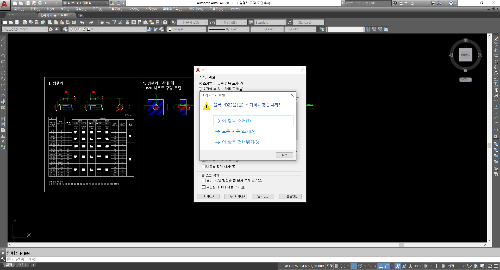 오토캐드로 작업을 하게 되면 보통 캐드도면 하나에 부품도면 조립도면을 모아놓게 됩니다. 그렇게 반복작업을 하다보면 쓰지않는 블럭이나 치수 등이 남아있게 되는데요. 그런 것들을 정리해주는 기능이 purge 입니다.