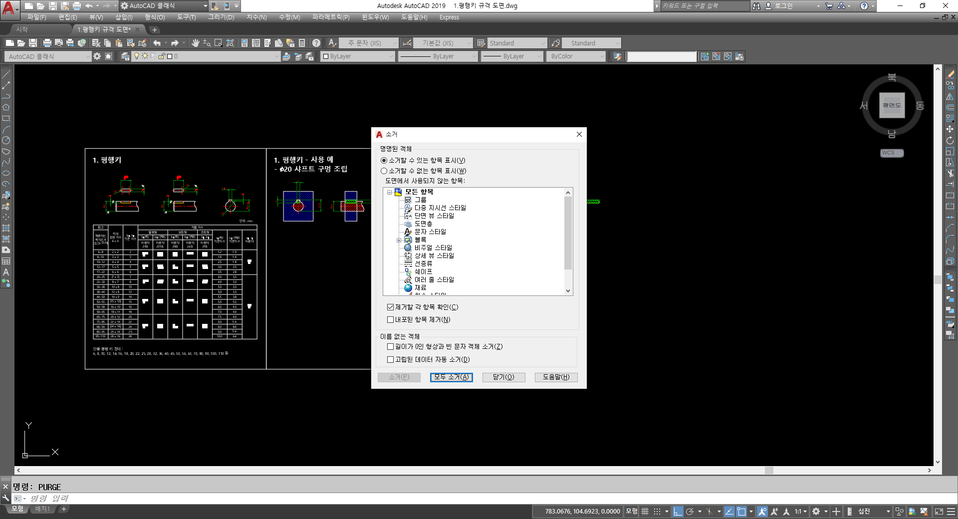 도면이 많이 쌓여 있으면 일일이 확인해서 지우기가 힘들겠죠? 그래서 모든 항목 소거를 해주면 지금 도면에서 사용하지 않는 것들을 삭제해줍니다. 필요없는 요소들이 많이 쌓여있다면 체감할 정도로 쾌적해질것입니다. 그렇지 않더라도 한번씩 정리 해주면 좋을 거라고 생각합니다.